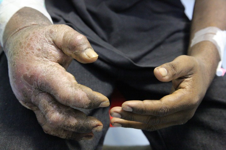 17 yr old male with 2 months of right arm swelling with multiple pustules and pungent odour. Likely filariasis with concurrent cellulitis.